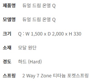 | 제품규격 | Q(퀸 사이즈) : W 1,500 x D 2,000 x H 330 mm |