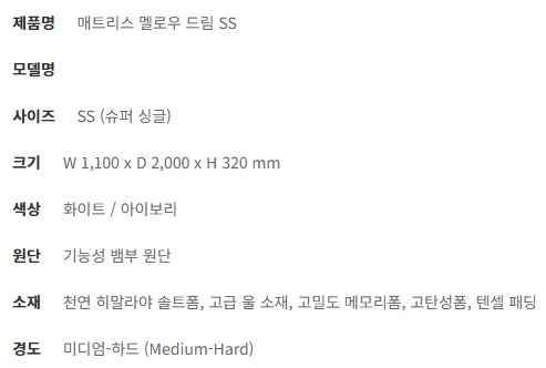 | 제품규격 | SS (슈퍼 싱글 사이즈) W 1,100 x D 2,000 x H 320 mm |